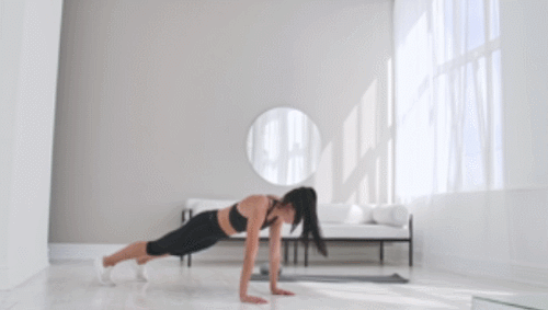 매트에 손을 대고 엎드리면서 플랭크 자세를 만듭니다. 그리고 왼쪽 다리를 오른쪽 팔꿈치로 당겼다가 되돌리고, 오른쪽 다리를 왼쪽 팔꿈치로 당겼다가 되돌립니다. 다리를 번갈아 움직이면서 1분간 운동하세요. 시선은 바닥을 향합니다.