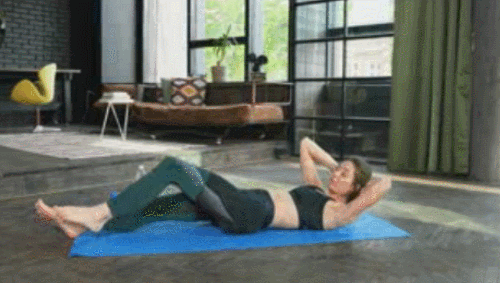 매트에 눕고, 손을 머리 뒤로 가져가 깍지 껴 잡습니다. 그리고 왼쪽 무릎을 당기면서 상체를 일으켜서 오른쪽 팔꿈치를 가져갑니다. 원래 자세로 돌아오면, 오른쪽 무릎을 당기는 동시에 왼쪽 팔꿈치를 가져가세요. 1분간 반복합니다.