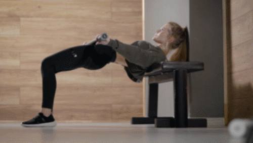 소파나 벤치 등에 등을 기대고 눕습니다. 어깨부터 무릎까지 라인을 직선으로 맞추도록 하세요. 그리고 골반에 아령이나 바를 올립니다. 그런 다음 엉덩이를 바닥으로 내렸다가 드는 동작을 반복하면 되는데요. 1분간 운동합니다.
