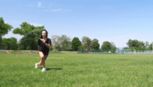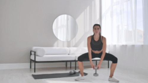 손에 아령이나 생수병 등을 들고 바닥에 서서 시작하세요. 다리는 최대한 넓게 벌립니다. 그리고 팔꿈치가 구부러지지 않도록 펴고, 무릎을 구부렸다가 드는 동작을 반복합니다. 1분 동안 진행하며, 상체는 구부러지지 않도록 펴주세요.