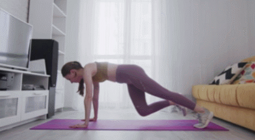 매트에 손바닥을 대고 엎드려서 플랭크 기본자세를 만듭니다. 그리고 오른쪽 다리를 당겼다가 돌아가고, 왼쪽 다리를 당기는 자세로 연결하세요. 처음에는 천천히 당겨주고, 속도를 조절하면서 운동 강도를 높입니다. 1분 동안 반복하세요.
