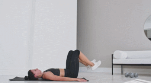 매트에 등을 대고 누른 상태에서 팔을 바닥에 지탱하고, 다리를 천천히 들어줍니다. 그리고 바닥과 90도 각도로 다리를 뻗어주면서 엉덩이와 등을 최대한 들어주면 되는데요. 리버스 크런치 동작을 1분 동안 반복하여 진행하세요.