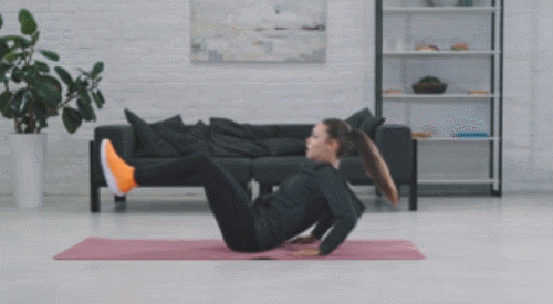 매트에 엉덩이를 대고 앉은 상태에서 팔뚝으로 지탱하고, 상체를 뒤로 기울입니다. 그리고 다리를 공중으로 뻗어주세요. 그런 다음 상체를 일으키면서 무릎을 구부려서 하체를 당겨줍니다. 다시 펴주면서 원래 자세로 돌아가면, 1회가 완료됩니다. 1분간 반복하세요.