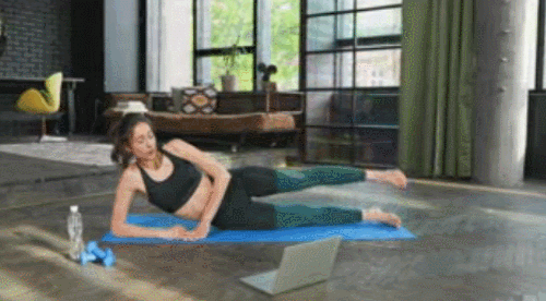 오른쪽 팔뚝을 대고 옆으로 누워서 시작하세요. 그리고 오른발은 매트에 붙인 상태에서 왼쪽 다리를 들었다가 내리는 동작을 진행하면 되는데요. 30초 진행 후, 반대편으로 눕고, 오른쪽 다리를 드는 동작을 30초 반복하세요.