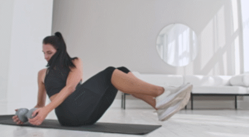 매트에 엉덩이를 대고 앉아서 손에 덤벨을 들고, 복부 앞으로 이동합니다. 그리고 상체를 뒤로 기울이면서 다리를 공중으로 띄우세요. 무릎을 살짝 구부리고, 균형을 유지합니다. 그런 다음 상체를 왼쪽으로 틀었다가 오른쪽으로 틀어주세요. 1분간 진행합니다.