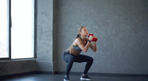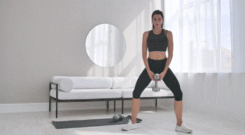 다리를 어깨너비보다 넓게 벌리고 서서 시작하세요. 손에 덤벨을 들고, 팔꿈치를 펴줍니다. 그리고 엉덩이를 내리면서 스쿼트 동작을 진행하세요. 운동 중에는 팔꿈치가 구부러지지 않도록 하고, 시선은 정면을 유지합니다. 1분간 운동하세요.