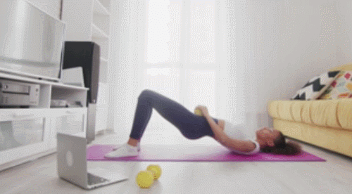 매트에 등을 대고 눕고, 골반 위에 덤벨을 올리세요. 손으로 잡아주면서 진행하면 되는데요. 엉덩이를 들고, 브릿지 자세를 만듭니다. 그리고 엉덩이를 내렸다가 들면서 브릿지 업다운 동작을 진행하세요. 1분 동안 반복합니다.