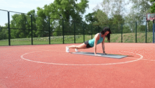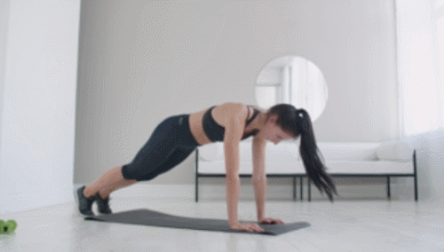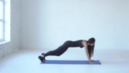 매트에 손을 대고 엎드려서 플랭크 기본자세를 만드세요. 그리고 하체부터 내리면서 상체까지 완전히 바닥에 붙이면 되는데요. 손바닥을 공중으로 완전히 들었다가 붙이면서 원래 자세로 돌아옵니다. 1분 동안 진행합니다.