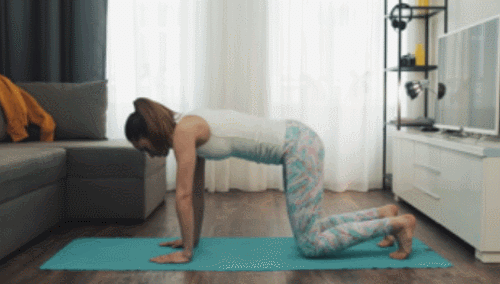 매트에 플랭크 자세로 엎드리세요. 그리고 손과 발의 간격을 점차 좁히면서 엉덩이를 공중으로 높이 들어줍니다. 그러면 다운도그 자세를 만들 수 있는데요. 팔꿈치와 무릎을 펴고, 발꿈치를 바닥에 붙이도록 합니다. 1분간 진행하세요.