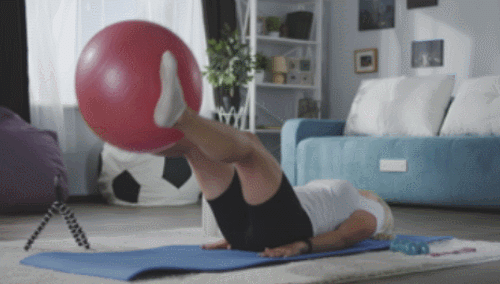 매트에 눕고, 다리 사이에 짐볼을 끼우세요. 그리고 다리에 힘을 주면서 짐볼이 떨어지지 않도록 자세를 유지합니다. 그런 다음 다리를 바닥과 90도 각도로 들었다가 내리는 레그레이즈 동작을 진행하세요. 1분간 반복합니다.
