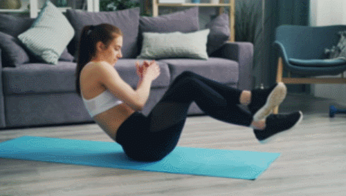엉덩이를 매트에 대고 앉아서 시작합니다. 상체를 뒤로 약간 기울이고, 다리를 공중으로 띄우며, 무릎을 구부리세요. 그리고 상체를 왼쪽으로 틀었다가 돌아오고, 오른쪽으로 틀었다가 돌아옵니다. 자세를 유지하면서 1분간 운동하세요.