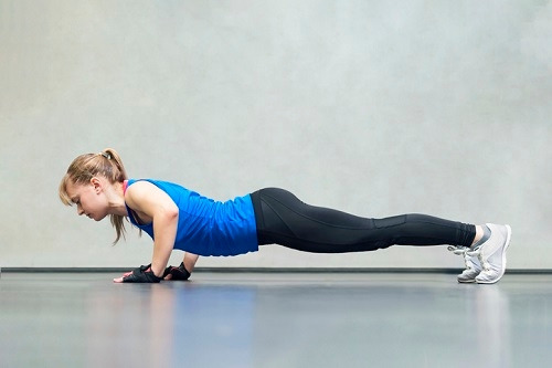 매트에 엎드린 상태로 플랭크 기본자세를 만드세요. 그리고 팔꿈치를 구부리면서 몸을 전체적으로 내렸다가 원래 자세로 돌아옵니다. 1분 동안 반복하고, 시선은 바닥을 응시하세요. 근력이 부족하다면, 무릎을 대고 진행해도 무방합니다.