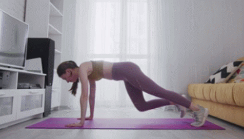 매트에 엎드린 상태로 플랭크 자세에서 준비하세요. 그리고 오른쪽 무릎을 왼쪽 손목 방향으로 최대한 당겼다가 되돌리고, 왼쪽 무릎으로 동일하게 반복합니다. 팔꿈치는 펴고, 시선은 바닥을 유지하세요. 1분 동안 다리를 움직입니다.