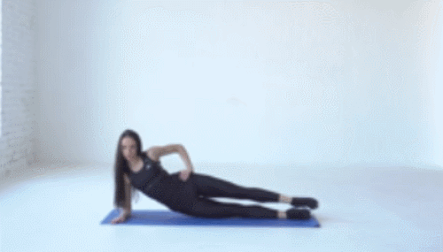 오른쪽 팔뚝을 매트에 대고 옆으로 누워서 준비하세요. 오른쪽 다리는 매트에 붙이고, 왼손은 허리 옆으로 옮깁니다. 그리고 왼쪽 다리를 들었다가 내리는 레그레이즈 동작을 30초 진행하세요. 반대편으로 돌아서 눕고, 동일하게 30초 반복합니다.