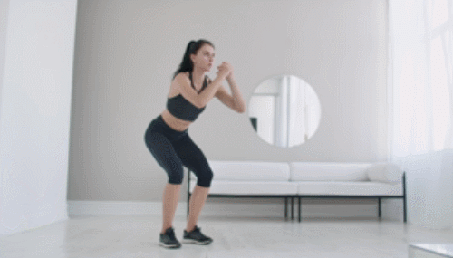 다리를 모으고 선 상태에서 손을 가슴 앞에서 모아줍니다. 그리고 무릎을 구부리면서 스쿼트 자세를 1회 진행하세요. 일어서면서 오른쪽 다리를 오른쪽으로 이동하면서 스쿼트 동작으로 연결합니다. 다리를 좌우로 움직이면서 1분간 스쿼트 동작을 반복하세요.