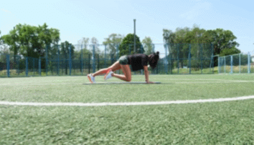 매트에 손바닥을 대고 엎드린 상태로 준비하세요. 그리고 왼쪽 무릎을 오른쪽 팔꿈치로 당겼다가 되돌리는 동시에 오른쪽 무릎을 왼쪽 팔꿈치로 당겼다가 되돌립니다. 1분 동안 크로스 니업 동작을 진행하세요. 100개를 목표로 합니다.