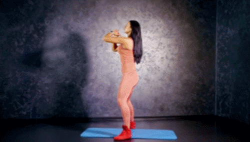 다리를 어깨너비보다 넓게 벌리고 서서 시작합니다. 손은 가슴 앞으로 모아서 잡아주세요. 그리고 무릎을 구부리면서 엉덩이를 낮췄다가 올리는 스쿼트 동작을 1분 동안 진행하세요. 시선은 정면을 향하고, 엉덩이를 조여줍니다.