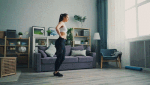 바닥에 다리를 모으고 서서 손을 옆구리에 가져갑니다. 그리고 왼쪽 다리를 앞으로 뻗으면서 무릎을 구부리고, 런지 동작을 진행합니다. 90도 각도로 구부린 후, 원래 자세로 돌아옵니다. 다리를 바꿔가면서 1분 동안 운동하세요.