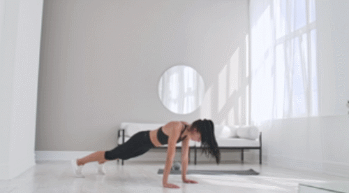 매트에 손바닥을 대고 엎드린 상태에서 팔꿈치를 완전히 펴주세요. 그리고 왼쪽 다리를 왼쪽 방향으로 이동했다가 돌아오고, 오른쪽 다리를 오른쪽으로 이동했다가 돌아옵니다. 시선은 바닥을 응시한 상태로 다리를 좌우로 1분간 움직이세요.