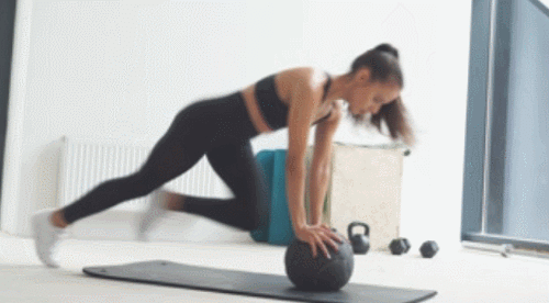 볼 위에 손을 올리고 엎드려서 준비하세요. 그리고 왼쪽 무릎을 당겼다가 되돌리는 동시에 오른쪽 무릎을 당겨주는 동작으로 연결합니다. 처음에는 천천히 반복하다가 점차 속도를 높이면서 다리를 움직이세요. 1분 동안 운동합니다.