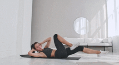 매트에 누운 상태에서 손을 머리 옆으로 옮기세요. 그리고 다리를 공중으로 띄웁니다. 그런 다음 왼쪽 무릎을 당기면서 상체를 틀어서 오른쪽 팔꿈치를 가져갔다가 오른쪽 무릎을 당기면서 왼쪽 팔꿈치를 가져가세요. 1분간 반복합니다.