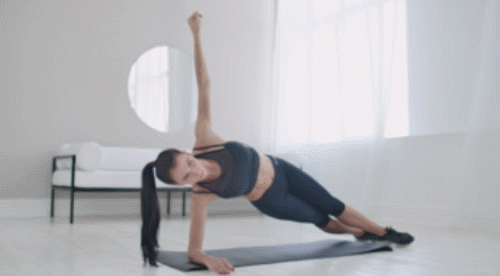 오른쪽 팔뚝을 매트에 대고 옆으로 누워서 시작하세요. 왼손은 공중으로 뻗습니다. 그리고 엉덩이를 들고, 자세를 유지하며 30초 동안 버팁니다. 이번에는 왼쪽 팔뚝으로 옆으로 눕는 자세에서 사이드 팔꿈치 플랭크 동작을 30초 동안 진행합니다.