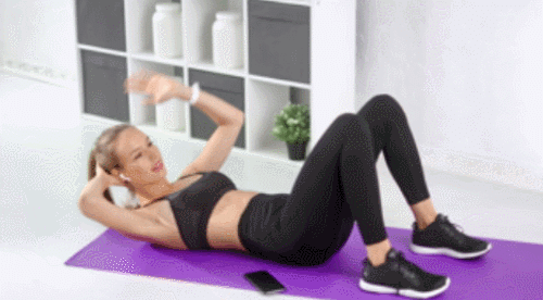 매트에 눕고, 무릎을 세우면서 발을 바닥에 고정합니다. 그리고 손을 머리 옆으로 옮기세요. 그런 다음 상체를 일으키면서 왼팔을 오른쪽 무릎 방향으로 뻗어주세요. 이번에는 상체를 일으키면서 오른팔을 왼쪽 무릎으로 뻗어줍니다. 1분간 반복하세요.