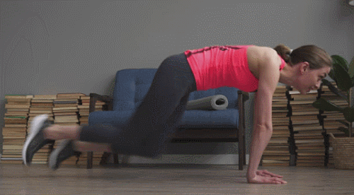 매트에 손을 대고 엎드린 상태에서 준비하세요. 그리고 왼쪽 무릎을 가슴으로 당겼다가 되돌리고, 오른쪽 무릎을 당겼다가 되돌립니다. 팔꿈치는 구부러지지 않도록 하고, 다리를 빠르게 움직이면서 1분 동안 운동합니다.