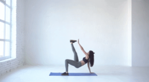 엉덩이를 매트에 대고 앉은 후, 손과 발을 바닥으로 누르면서 몸을 공중으로 띄우세요. 몸을 전체적으로 테이블 모양으로 만듭니다. 그리고 왼쪽 다리를 공중으로 들면서 오른팔을 뻗어주고, 오른쪽 다리를 들면서 왼팔을 뻗어주세요. 1분간 반복합니다.