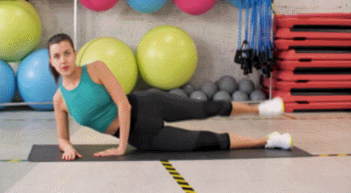오른쪽 팔뚝을 옆으로 대고 누워서 시작합니다. 그리고 오른쪽 다리는 바닥에 붙이고, 왼쪽 다리를 들었다가 내리는 동작을 30초 동안 반복하세요. 다리를 교차하면서 진행합니다. 반대편 다리로도 30초 반복하세요.