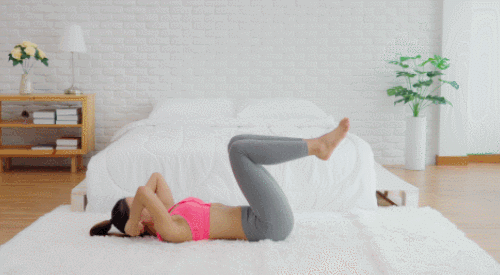 매트에 등을 대고 누운 후, 다리를 공중으로 뻗어서 무릎을 90도 각도로 구부립니다. 그리고 손을 머리 옆으로 이동하세요. 그런 다음 상체를 일으켰다가 내리는 동작을 반복하면 되는데요. 복부를 압박하면서 1분간 운동하세요.