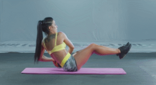 매트에 엉덩이를 대고 앉은 후, 상체를 뒤로 기울이고, 다리를 공중으로 띄우며, 무릎을 구부립니다. 손에는 볼이나 생수병을 들어주세요. 그리고 상체를 왼쪽으로 틀었다가 돌아오고, 오른쪽으로 틀었다가 돌아옵니다. 1분간 운동하세요.