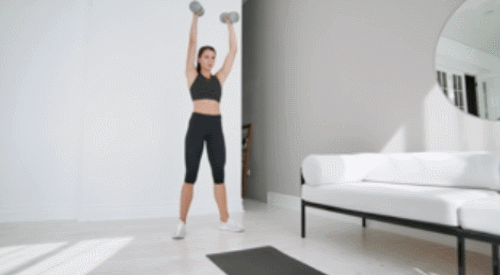 아령을 손에 들고 바닥에 서서 시작하세요. 어깨너비보다 넓게 다리를 벌리고, 손을 머리 위로 올립니다. 엉덩이를 내리면서 팔꿈치를 구부려서 아령을 내려줍니다. 스쿼트를 반복하면서 손을 위아래로 움직이세요. 1분 동안 반복합니다.