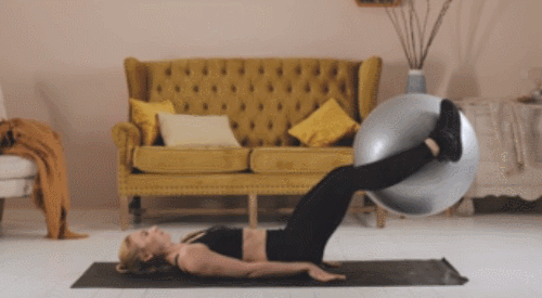 매트에 등을 대고 누운 상태에서 다리 사이에 짐볼을 끼웁니다. 그리고 다리 사이에 힘을 주면서 천천히 공중으로 들어주세요. 그런 다음 다리를 내렸다가 들면서 레그레이즈 동작을 진행하세요. 허리가 떨어지지 않도록 하고, 1분간 운동합니다.