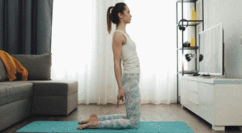 매트에 무릎을 꿇고 앉은 후, 상체를 일으키세요. 그리고 상체를 천천히 뒤로 젖히면서 손으로 발목을 잡거나 발바닥을 잡습니다. 고개를 뒤로 완전히 떨어뜨리고, 자세를 유지하며 호흡합니다. 1분 동안 반복하세요.