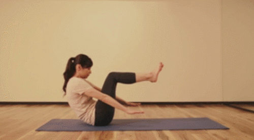 매트에 엉덩이를 대고 앉은 후, 상체를 약간 뒤로 기울이면서 다리를 공중으로 들어줍니다. 그리고 팔을 앞으로 뻗고, 무릎을 구부리세요. 그런 다음 팔을 위아래로 움직이면서 상체와 하체를 폈다가 당겨주세요. 1분간 반복합니다.
