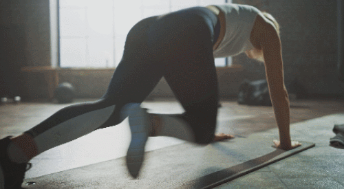 매트에 엎드려서 플랭크 자세로 시작합니다. 그리고 왼쪽 다리를 당겼다가 되돌리면서 오른쪽 다리를 당기는 동작으로 연결하세요. 처음에는 천천히 진행하다가 점차 속도를 높이면서 빠르게 반복하세요. 1분간 운동합니다.