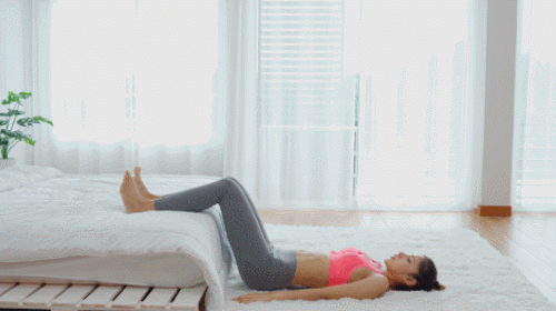 침대나 소파에 다리를 올리고, 바닥에 누워서 준비하세요. 그리고 손을 바닥으로 누르면서 엉덩이를 들어서 브릿지 자세를 만듭니다. 무릎에서 어깨까지 라인을 맞췄다가 다시 내려옵니다. 1분 동안 엉덩이를 들었다가 내리세요.
