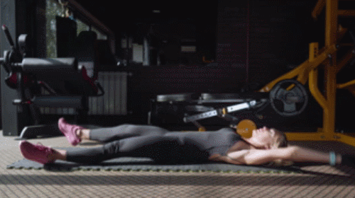 매트에 누운 상태에서 다리를 바닥과 90도 각도로 들어주고, 무릎을 완전히 펴줍니다. 그리고 손을 머리 위로 뻗습니다. 그런 다음 상체를 일으키면서 손을 당겨서 발끝으로 가져가세요. 1분 동안 크런치 변형 동작을 반복합니다.