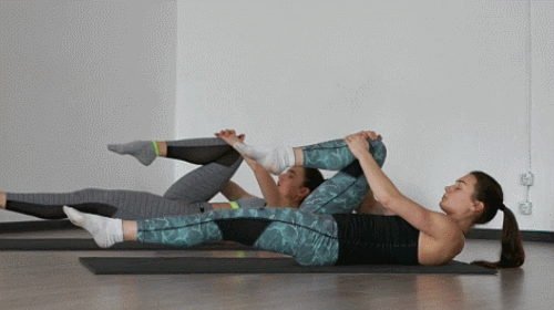 매트에 누워서 다리를 공중으로 살짝 띄웁니다. 그리고 상체를 일으킵니다. 그런 다음 왼쪽 무릎을 당기면서 양손으로 정강이를 눌러주고, 오른쪽 무릎을 당기면서 양손으로 잡아줍니다. 1분 동안 다리를 당기는 동작을 진행하세요.