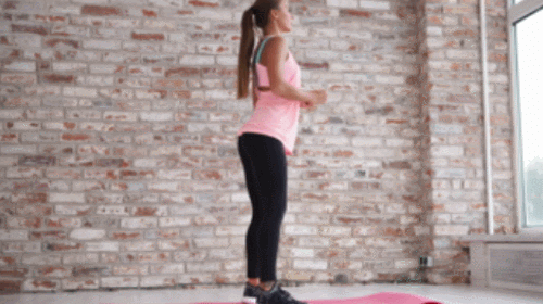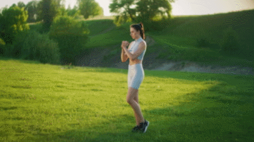 다리를 어깨너비보다 넓게 벌리고 서서 시작하세요. 그리고 엉덩이를 바닥으로 내리면서 스쿼트를 진행하고, 손은 가슴 앞으로 모아줍니다. 시선은 앞을 향하고, 상체는 구부러지지 않도록 하세요. 1분 동안 운동하고, 100개를 목표로 합니다.