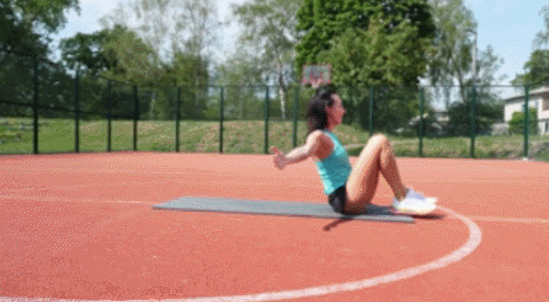 매트에 엉덩이를 대고 앉은 상태에서 손을 옆으로 펼칩니다. 그리고 상체를 뒤로 완전히 누우면서 양손으로 정강이를 감싸주세요. 다시 원래 자세로 돌아오면서 손을 펼쳐줍니다. 1분 동안 구르는 동작을 반복하세요.