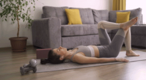 매트에 등을 대고 누운 상태에서 다리를 공중으로 띄웁니다. 그리고 무릎을 구부리세요. 그런 다음 왼쪽 다리를 오른쪽 허벅지에 걸치고, 다리 사이의 공간으로 손을 넣어 잡아주세요. 좌우로 움직이거나 당겨줍니다. 다리를 번갈아 가면서 1분간 운동하세요.