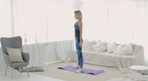 허벅지에 탄력 밴드를 끼우고, 바닥에 서서 어깨너비보다 넓게 다리를 벌립니다. 그리고 엉덩이를 바닥으로 낮추면서 스쿼트 진행하세요. 동시에 손은 가슴 앞으로 모읍니다. 1분 동안 스쿼트 동작을 반복하세요.