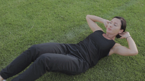매트에 누운 상태에서 다리를 공중으로 띄웁니다. 그리고 손을 머리 옆으로 옮기고, 상체를 약간 일으키세요. 그런 다음 무릎을 당기면서 팔꿈치를 구부려서 복부 전체를 압박했다가 원래 자세로 돌아가세요. 1분 동안 반복합니다. 100개를 목표로 하세요.
