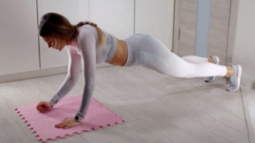 매트에 엎드린 상태에서 오른쪽 팔꿈치를 구부리고, 왼쪽 팔꿈치를 구부려서 팔꿈치 플랭크 자세를 만듭니다. 그리고 다시 팔꿈치를 펴면서 원래 자세로 돌아오면 되는데요. 1분 동안 플랭크 업다운 동작을 반복하세요. 100개를 나눠서 진행하세요.
