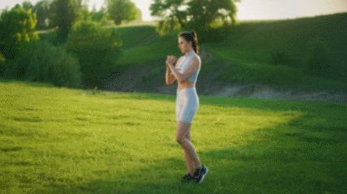 다리를 어깨너비보다 넓게 벌리고 서서 시작하세요. 손은 가슴 앞으로 가져가고, 무릎을 구부리면서 엉덩이를 바닥으로 낮춥니다. 허벅지가 바닥과 평행하도록 하고, 원래 자세로 돌아오세요. 1분 동안 스쿼트 동작을 진행합니다.