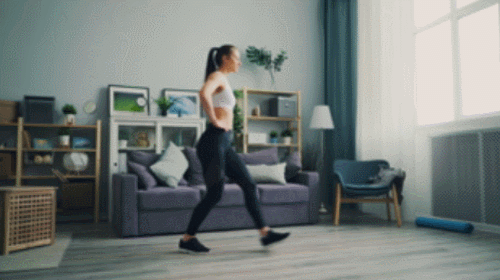 바닥에 서서 손을 옆구리에 가져가세요. 그리고 왼쪽 다리를 앞으로 내딛고, 무릎을 구부리면서 런지 동작을 진행합니다. 원래 자세로 돌아오면, 오른쪽 다리를 앞으로 내딛고, 런지 동작을 반복하세요. 1분간 진행합니다.