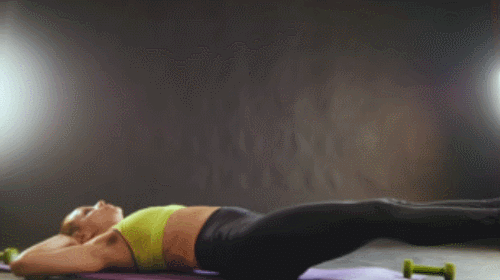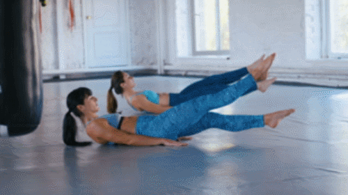 매트에 누운 상태에서 손을 머리 옆으로 옮기세요. 그리고 다리를 공중으로 띄웁니다. 그런 다음 다리를 당기면서 상체를 일으켜서 복부를 자극합니다. 1분 동안 상체와 하체를 접었다가 펴주세요.