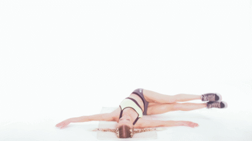 매트에 누운 후, 다리를 바닥과 90도 각도로 공중으로 들어주세요. 그리고 다리를 왼쪽으로 넘겼다가 돌아오고, 오른쪽으로 넘겼다가 돌아옵니다. 팔은 양옆으로 펼치고, 무릎은 완전히 펴주세요. 1분간 운동합니다.